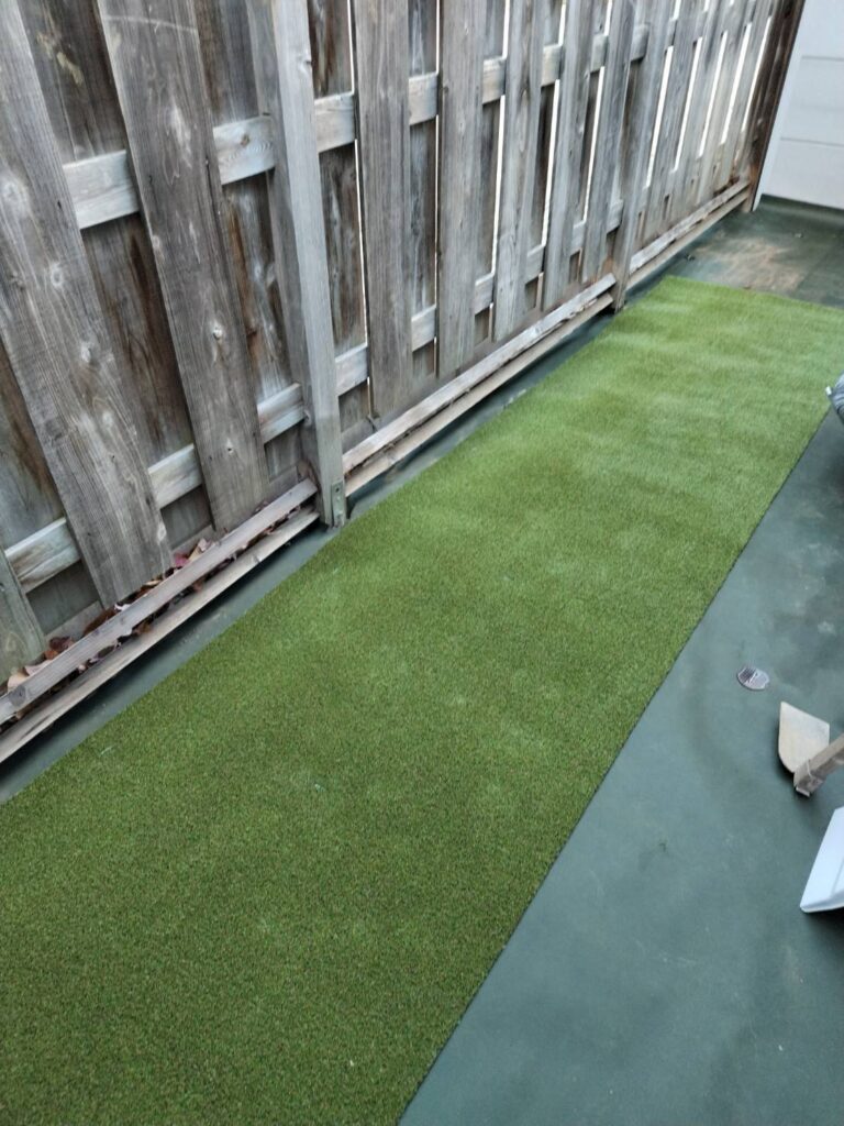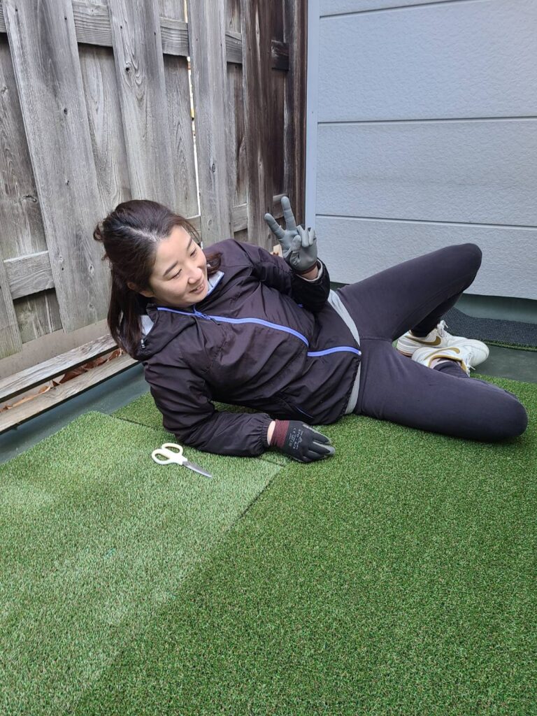 防草シートが引けると人工芝です。こちらはホームセンターの在庫がなく、千野が店舗を回ってくれ何とか購入することが出来ました。