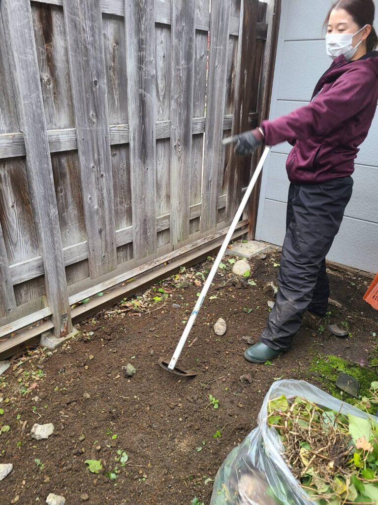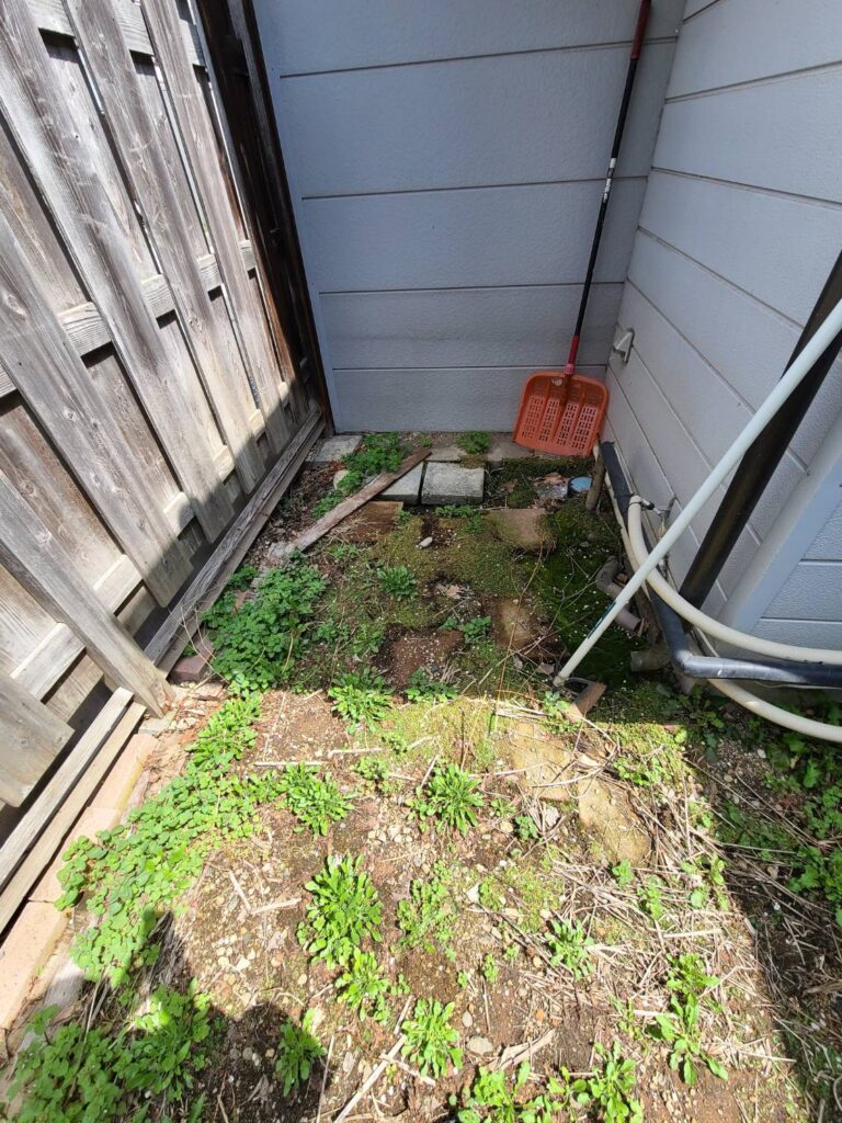 デコボコ、草ぼ―ぼー、前の住人の置忘れのごみなど荒れ果てた状態でした。